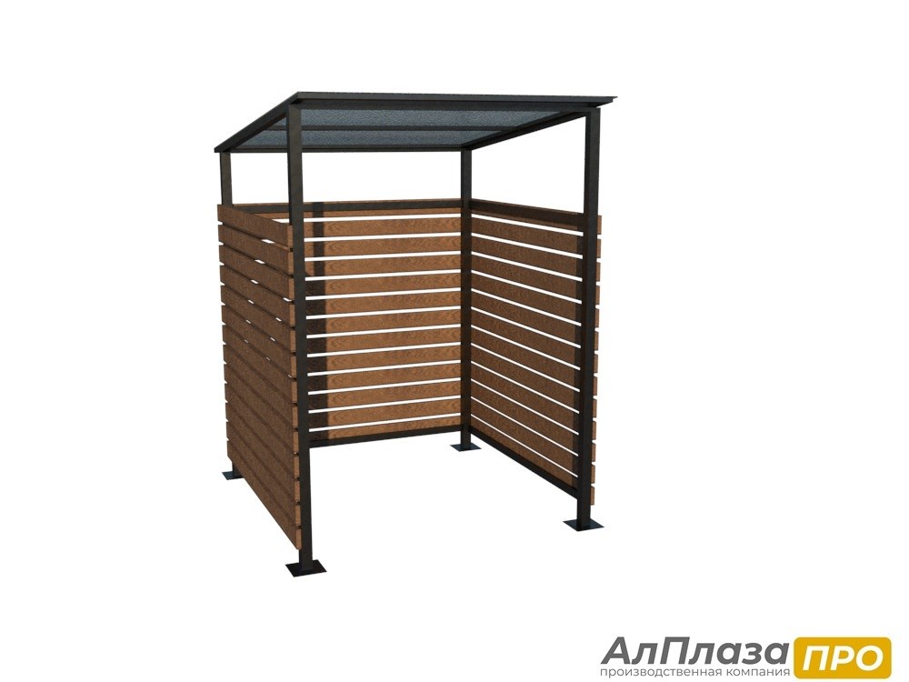 Ограждение для контейнерной площадки серии "FORESTER LITE" (1 контейнер) изготавливается из металлического каркаса сечением 50*50*1,5 и 40*20*1,5. Каркас окрашивается полимерно-порошковой краской, цвет можно выбрать по каталогу RAL. Боковые стенки доской из лиственницы покрытой лаком. Цвет так же можно выбрать согласно каталогу. Крепление доски производится при помощи саморезов к каркасу ограждения. Крыша покрыта прозрачным сотовым поликарбонатом толщиной 6 мм. Крепление ограждения ТБО возможно как к бетонному основанию при помощи анкеров, а также при помощи бетонирования столбов в грунте.