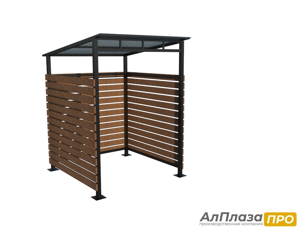 Ограждение для контейнерной площадки серии "FORESTER LITE" (1 контейнер) изготавливается из металлического каркаса сечением 50*50*2,0 и 40*20*1,5. Каркас окрашивается полимерно-порошковой краской, цвет можно выбрать по каталогу RAL. Боковые стенки доской из лиственницы покрытой лаком. Цвет так же можно выбрать согласно каталогу. Крепление доски производится при помощи саморезов к каркасу ограждения. Крыша покрыта прозрачным сотовым поликарбонатом толщиной 6 мм. Крепление ограждения ТБО возможно как к бетонному основанию при помощи анкеров, а также при помощи бетонирования столбов в грунте.