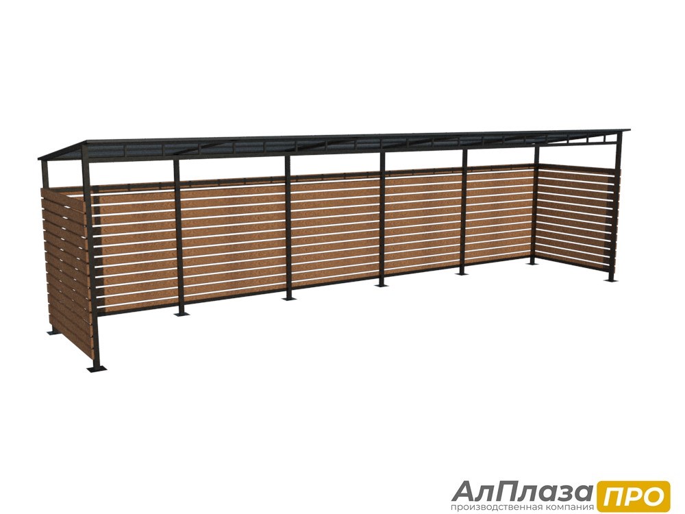 Ограждение для контейнерной площадки серии "FORESTER LITE" (4 контейнера+Доп. секция) изготавливается из металлического каркаса сечением 50*50*2,0 и 40*20*1,5. Каркас окрашивается полимерно-порошковой краской, цвет можно выбрать по каталогу RAL. Боковые стенки доской из лиственницы покрытой лаком. Цвет так же можно выбрать согласно каталогу. Крепление доски производится при помощи саморезов к каркасу ограждения. Крыша покрыта прозрачным сотовым поликарбонатом толщиной 6 мм. Крепление ограждения ТБО возможно как к бетонному основанию при помощи анкеров, а также при помощи бетонирования столбов в грунте.