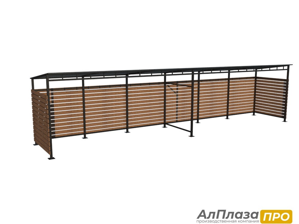 Ограждение для контейнерной площадки серии "FORESTER LITE" (4 контейнера+Доп. секция) изготавливается из металлического каркаса сечением 50*50*2,0 и 40*20*1,5. Каркас окрашивается полимерно-порошковой краской, цвет можно выбрать по каталогу RAL. Боковые стенки доской из лиственницы покрытой лаком. Цвет так же можно выбрать согласно каталогу. Крепление доски производится при помощи саморезов к каркасу ограждения. Крыша покрыта прозрачным сотовым поликарбонатом толщиной 6 мм. Крепление ограждения ТБО возможно как к бетонному основанию при помощи анкеров, а также при помощи бетонирования столбов в грунте.