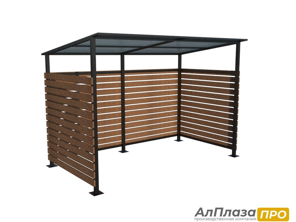 Ограждение для контейнерной площадки серии "FORESTER LITE" (2 контейнера) изготавливается из металлического каркаса сечением 50*50*1,5 и 40*20*1,5. Каркас окрашивается полимерно-порошковой краской, цвет можно выбрать по каталогу RAL. Боковые стенки доской из лиственницы покрытой лаком. Цвет так же можно выбрать согласно каталогу. Крепление доски производится при помощи саморезов к каркасу ограждения. Крыша покрыта прозрачным сотовым поликарбонатом толщиной 6 мм. Крепление ограждения ТБО возможно как к бетонному основанию при помощи анкеров, а также при помощи бетонирования столбов в грунте.